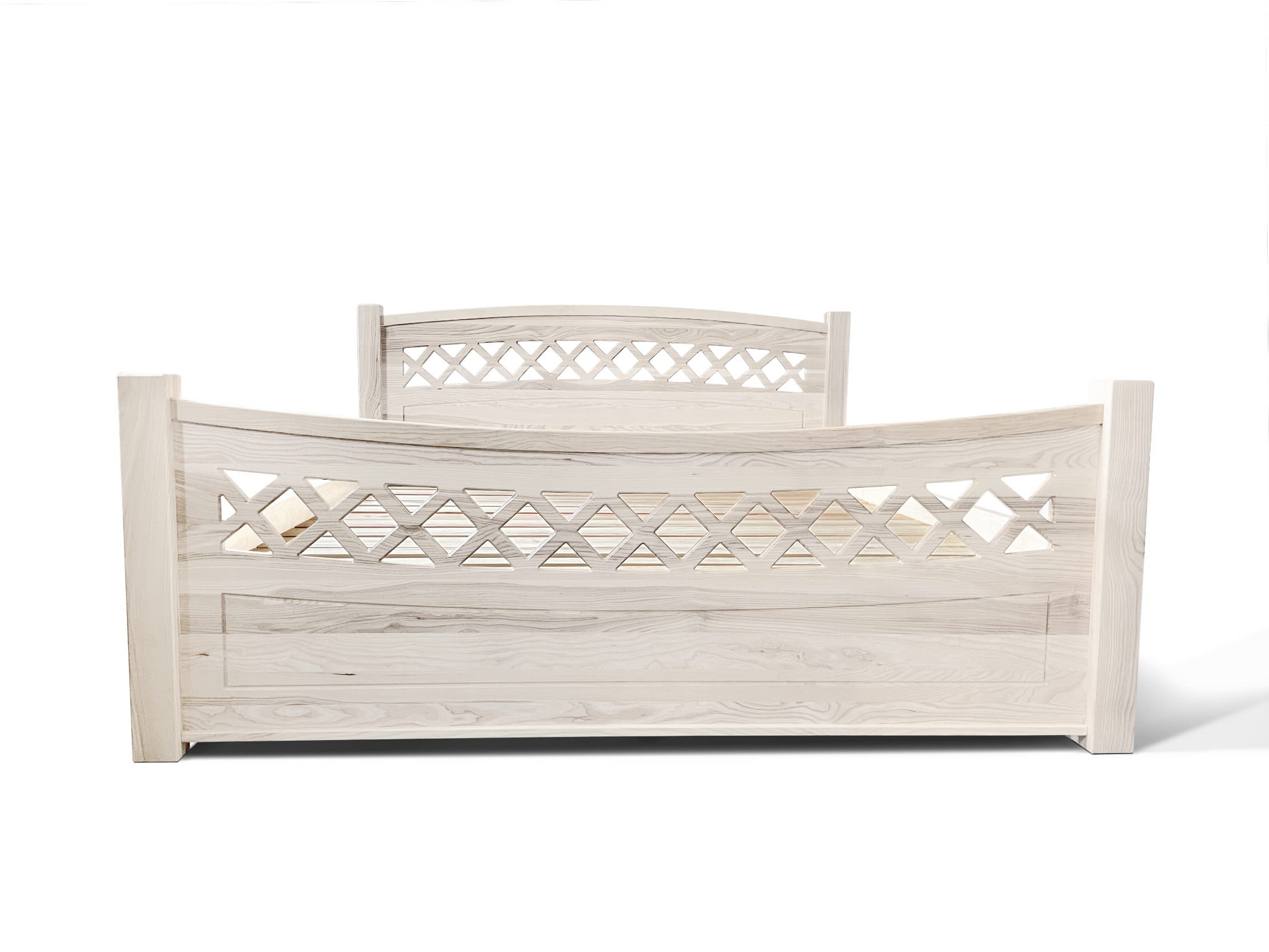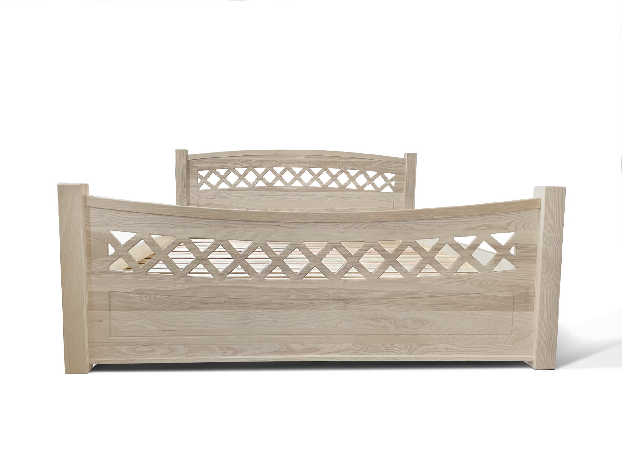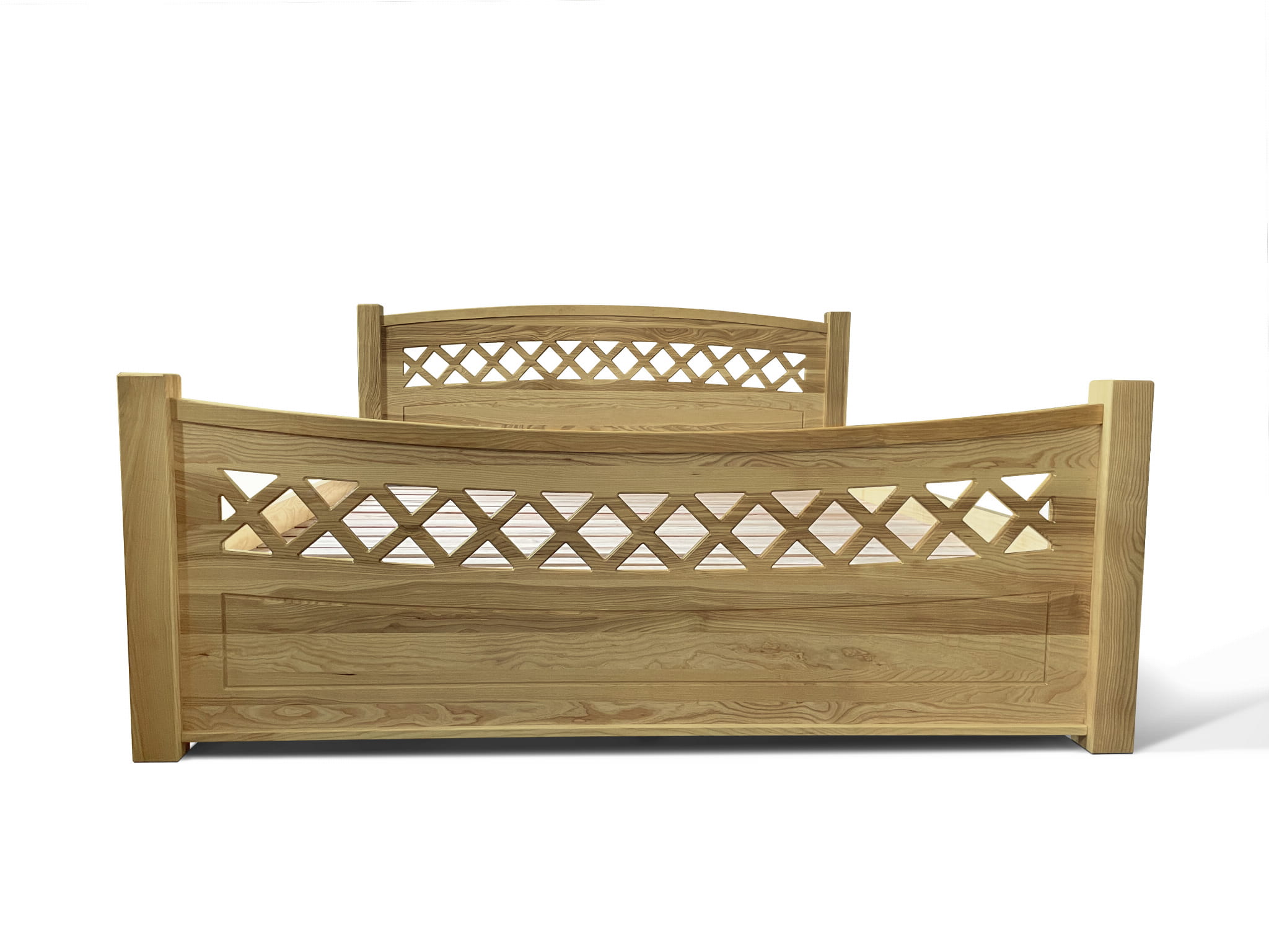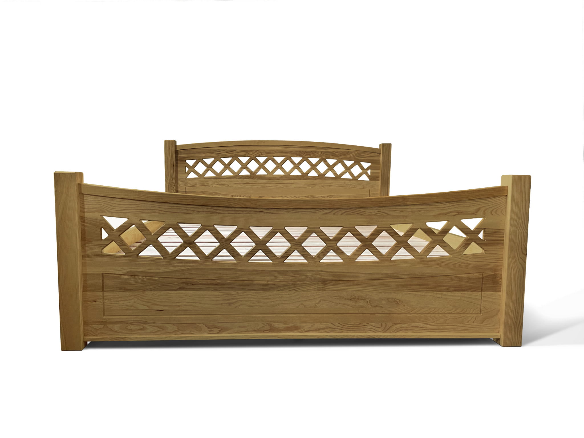 Rama łóżka obejmuje efektownie wygięte wezgłowie oraz podnóżek, połączone dwiema stabilnymi deskami bocznymi. Charakterystycznym motywem projektu jest łuk – obecny zarówno w formie wezgłowia i części nożnej, jak i w elementach dekoracyjnych. Ażurowe zdobienia w postaci rombów o różnych wymiarach nadają konstrukcji lekkości wizualnej, a ich krawędzie wykończone frezem pod kątem 45° zapewniają wygodę użytkowania i elegancki wygląd.