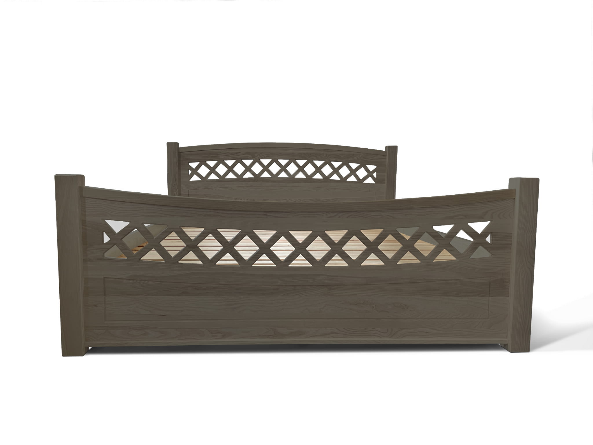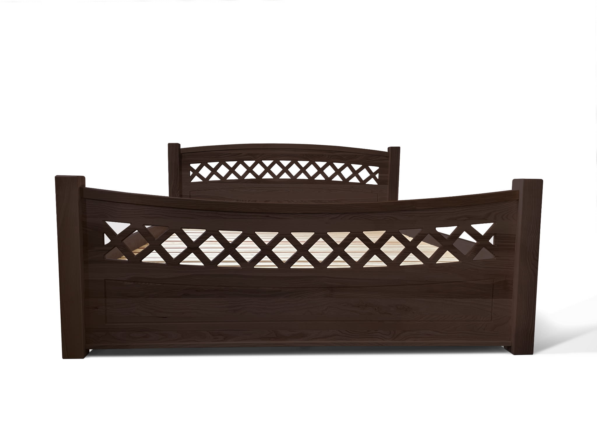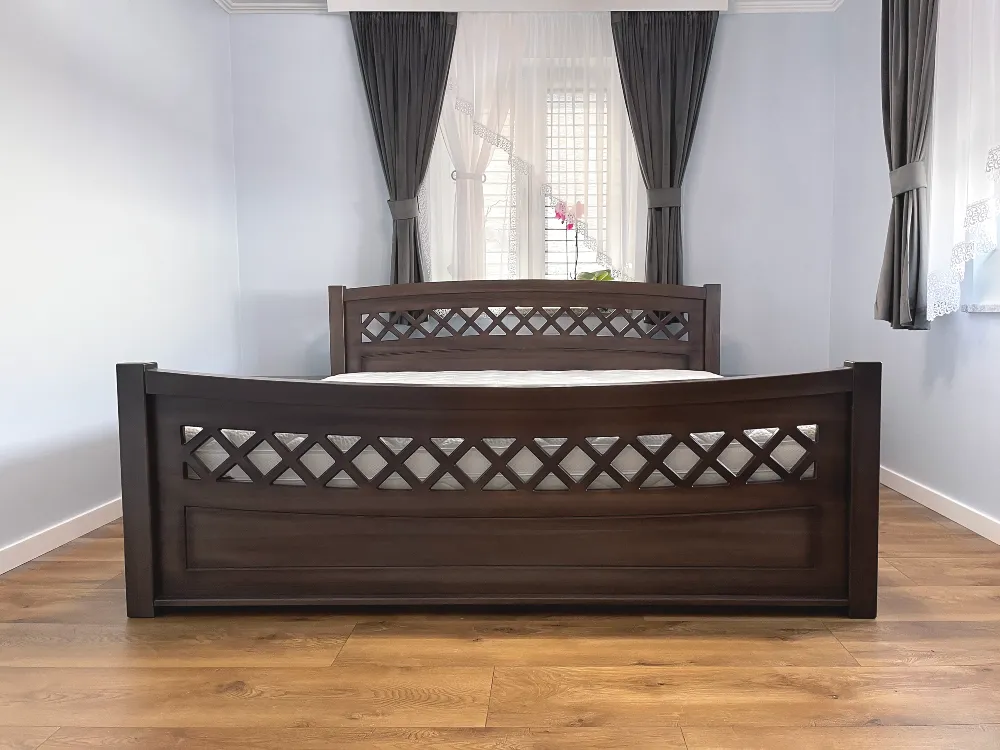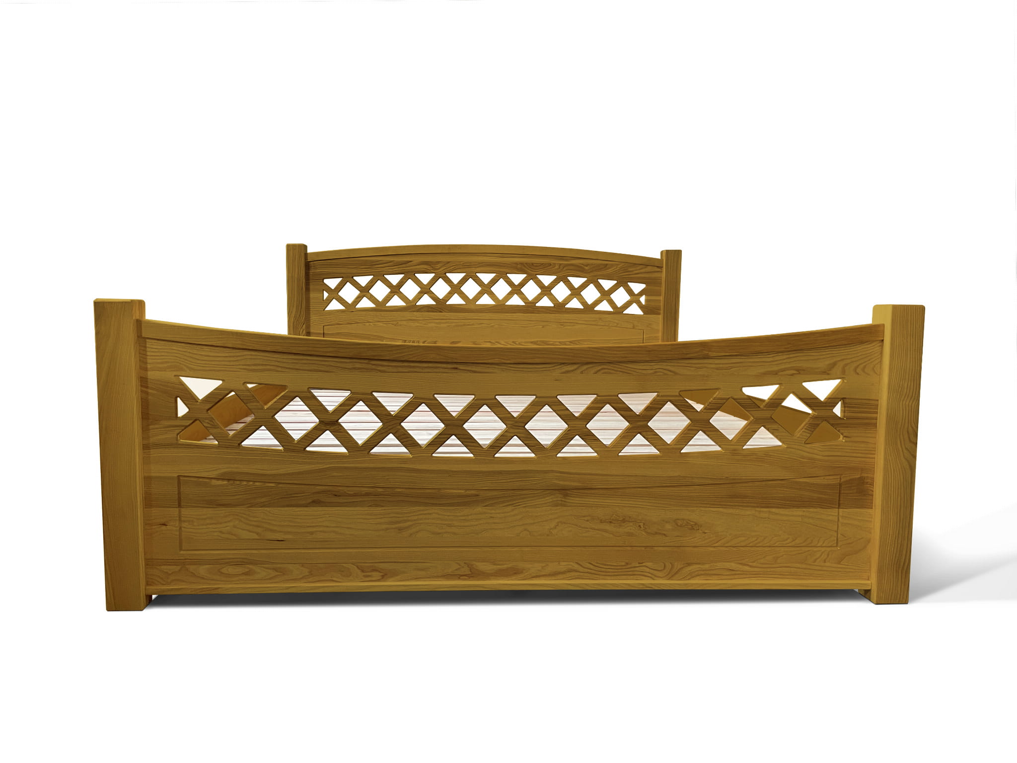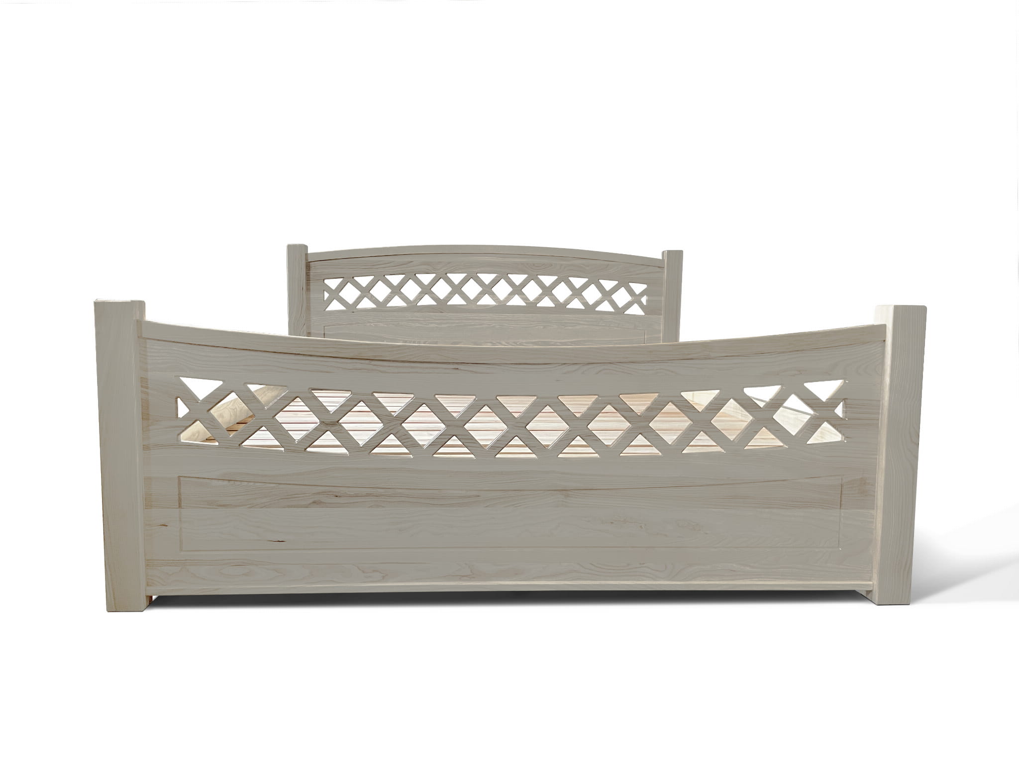 Rama łóżka obejmuje efektownie wygięte wezgłowie oraz podnóżek, połączone dwiema stabilnymi deskami bocznymi. Charakterystycznym motywem projektu jest łuk – obecny zarówno w formie wezgłowia i części nożnej, jak i w elementach dekoracyjnych. Ażurowe zdobienia w postaci rombów o różnych wymiarach nadają konstrukcji lekkości wizualnej, a ich krawędzie wykończone frezem pod kątem 45° zapewniają wygodę użytkowania i elegancki wygląd.