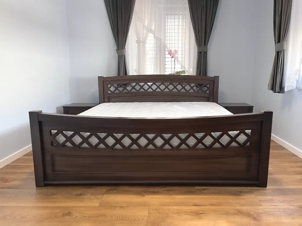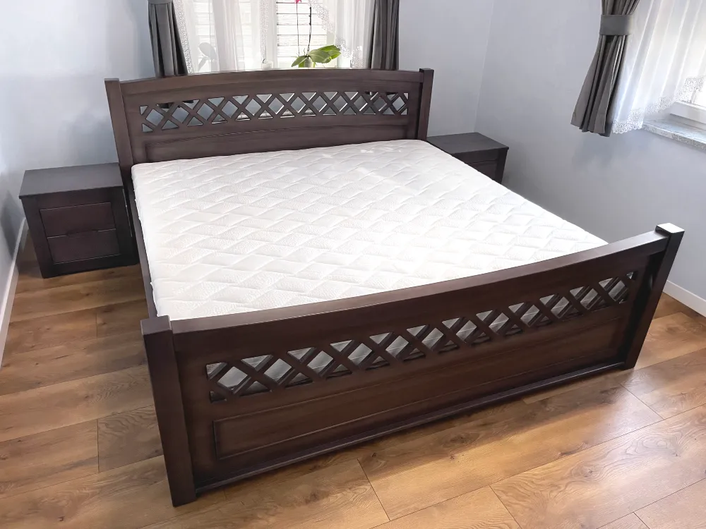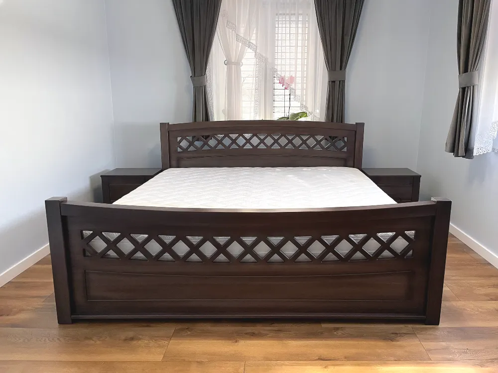 Łóżko składa się z czterech głównych elementów: wezgłowia, podnóżka oraz dwóch boków z litego drewna. Połączenia czopowane, ozdobne poręcze oraz ażurowy front filunkowy podkreślają wysoką klasę wykonania. Stabilny system montażowy na blachach gwarantuje łatwy montaż i wieloletnią trwałość.