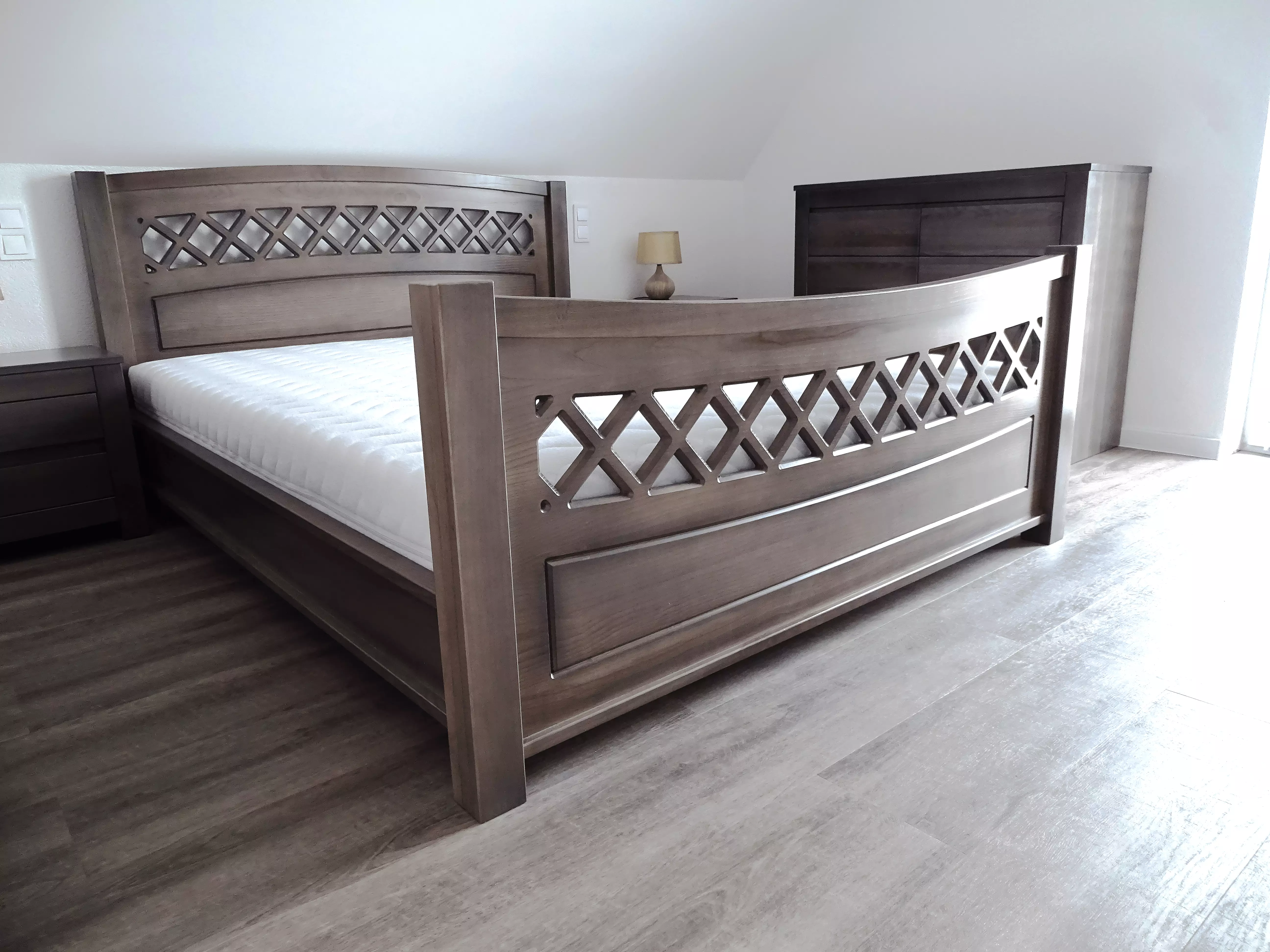 Mebel wykonany jest z 4 elementów. Wezgłowie oraz podnóżek wykonane są na połączeniach czopowanych z nogami o grubości 8x8 cm i zakończonych ozdobną poręczą. Dodatkowym atutem jest ażurowy front filunkowy nadający łóżku odpowiedniej klasy. System mocowania jest sprawdzony i gwarantuje długie użytkowanie. Boki łóżka wykonane są z litej deski zakończone ozdobnymi listwami. Całe łoże montowane jest na szybkich blachach montażowych.